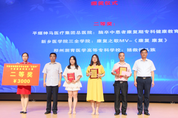 开幕式由河南省物理医学学会会长、新乡医学院三全学院康复医学院副院长刘强主持,新乡医学院三全学院院长胡仕坤致欢迎辞。开幕式上首先颁发了首届“百昌杯”中原康复科普大赛奖项。经过一个月的激烈角逐我院的视频作品“康复之歌MV--《康复 康复》”以欢快的曲调、丰富多彩的科普内容,展现康复朝气蓬勃之势,从56家单位95件作品中脱颖而出,荣获大赛二等奖,获得了3000元奖金。