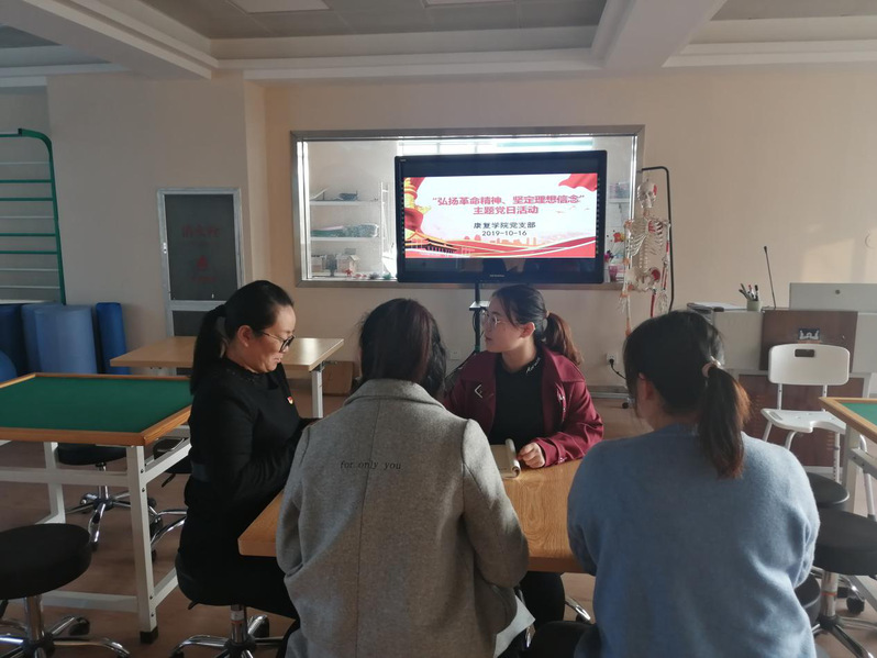活动开始,康复学院党支部书记梅静组织所在支部党员开展学习研讨“弘扬革命精神、坚定理想信念”,并向所在支部报告自己心得体会。         梅静认为:作为一名党员干部,必须真正坚定理想信念,牢记责任使命,坚持务实创新,坚守廉洁自律,以抓铁留痕、踏石留印的实干精神为中国新时代的发展积聚正能量。作为党员教师以身作则,为人师表,真正起到“学高为师,德高为范”作用,以正确的思想来引导学生、用高尚的德行来感化学生,用大方的仪表来影响学生。爱岗敬业,关爱学生,用自己的模范带头作用给学生树立榜样。