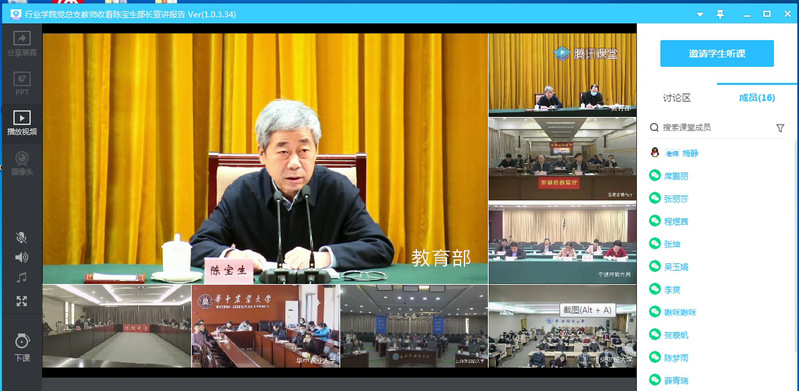 为了在教育系统掀起学习贯彻五中全会精神热潮,根据教育部、省教育厅通知,学校党委要求,行业学院党总支于11月12下午积极组织没课的老师到总支党员活动室(康复医学院一楼)收看教育部陈宝生部长11日下午宣讲报告会视频,有课的老师于晚上7点由康复学院党支部书记带领大家召开视频会议统一收看,共计52名教师参与收看学习。